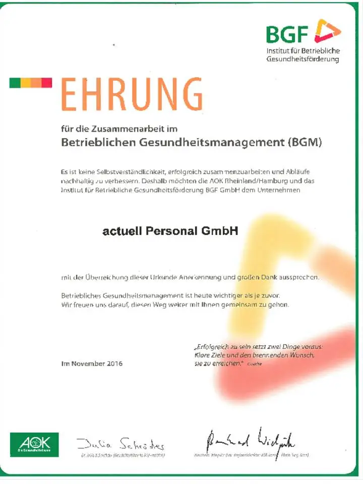 AOK zeichnet actuell-Team für vorbildlichen Gesundheitsschutz aus