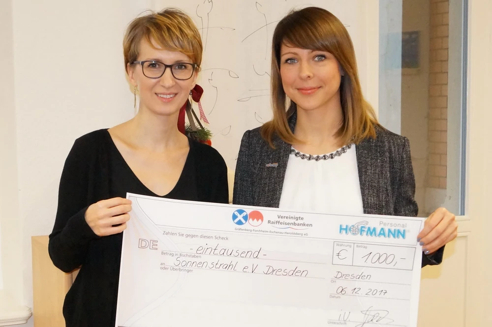 Hofmann Personal spendet 1000 Euro an Sonnenstrahl e.V., ein Verein, der sich um Kinder und Jugendliche mit Krebs sowie ihre Familien kümmert