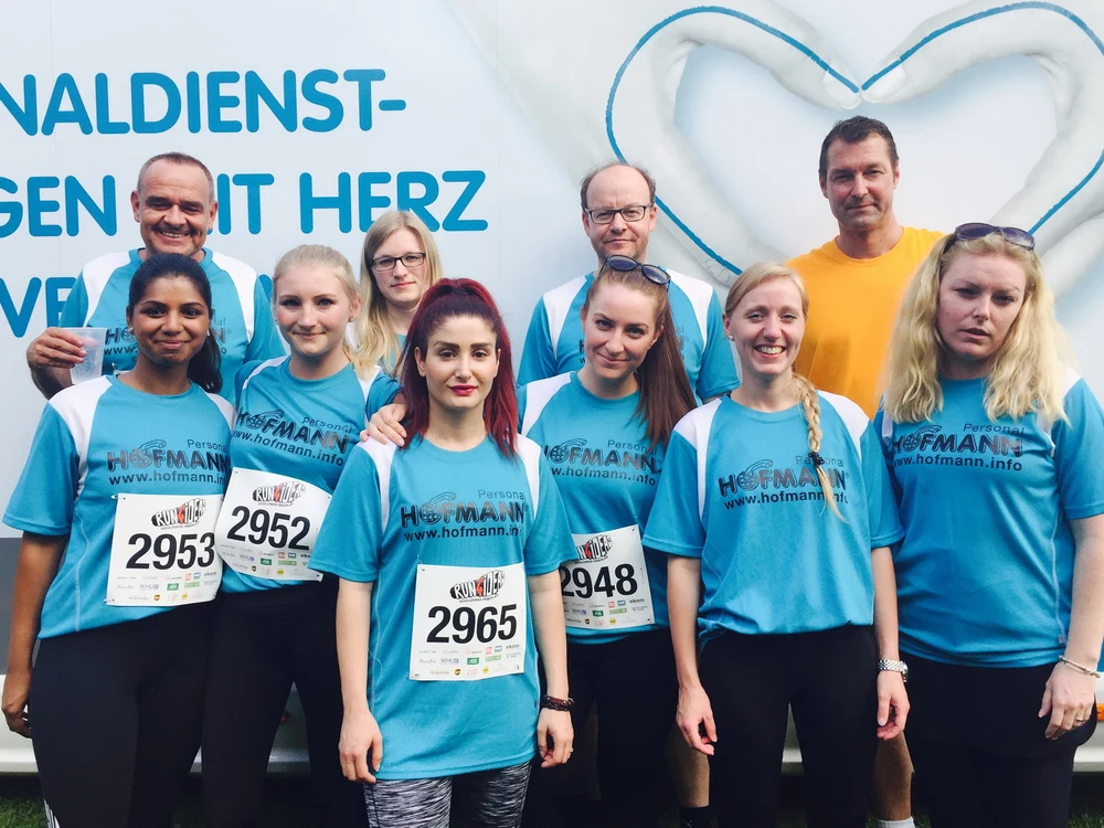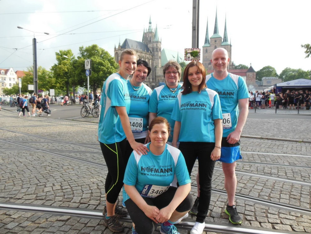 Hofmann-Team läuft beim Erfurter Unternehmenslauf im Rahmen des Hofmann Spendenmarathons für eine Spende an die Deutsche Knochenmarkspenderdatei (DKMS)