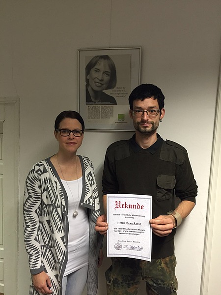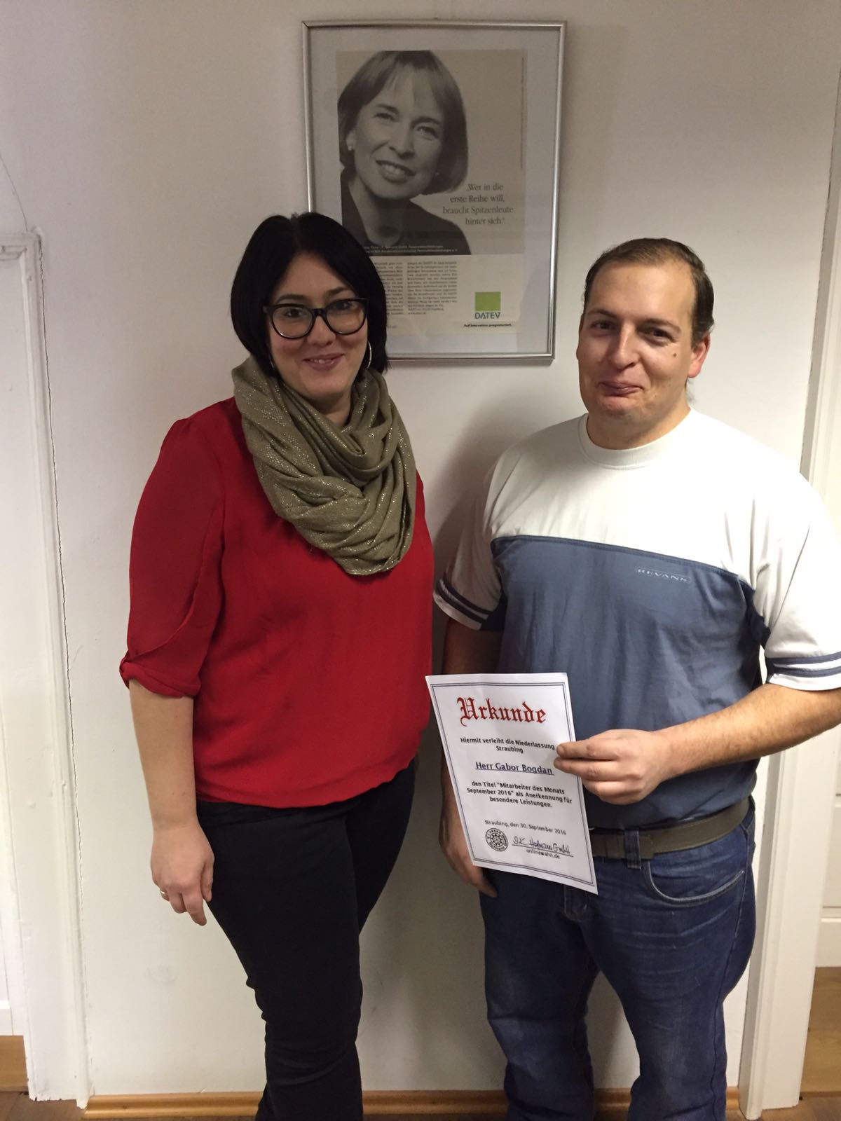 Dezember 16 - „Wir haben super tolle Mitarbeiter und ich möchte, dass das auch wahrgenommen wird. Darum zeichnen wir bei entsprechender Leistung unsere Mitarbeiter aus. Ich sage Danke schön an Ilirjan Beleri, Gabor Bogdan, Zamfirel Filip, János Richard Lovász, Alaex Nasarenko, Steve Rackl, Bernhard Wagner und Malgorzata Wodniok“, sagt Büroverantwortliche Marlene Gebhardt.