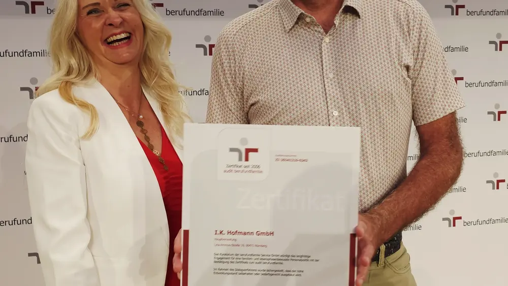 Im Namen von Hofmann Personal nimmt Michael Bayerlein die Zertifizierungsurkunde von „berufundfamilie“ entgegen.