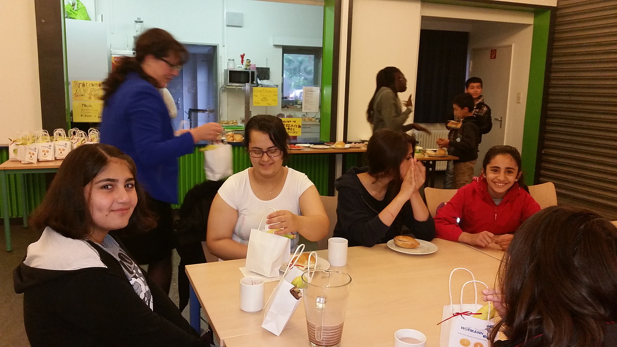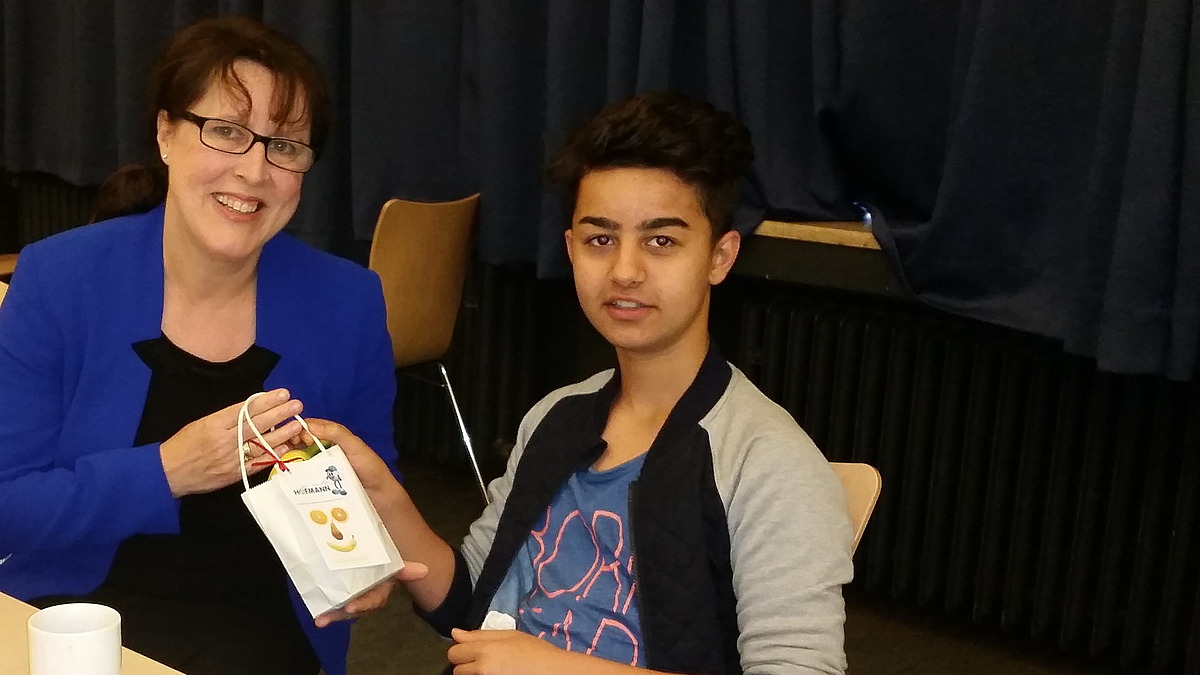 Juni 2016 – Iris Altintop, Assistentin der Regionalgebietsleitung, hat sich auf den Weg gemacht, um Schülern der Peter-Ustinov-Schule ein nettes Schulfrühstück zu bereiten. Sie erzählt: „Gemeinsam mit Frau Burniki habe ich den Kindern von uns gefüllte Obsttüten übergeben. Äpfel, Kiwis und Bananen sorgten hier für einen kräftigen Vitaminschub. Die Konrektorin Frau Günther hatte gar nicht mehr mit uns gerechnet, da dieses Hofmann-Projekt eigentlich offiziell ausgelaufen war. Für uns jedoch kein Grund, den Kindern nicht doch noch eine Freude zu bereiten!“, so Iris Altintop.
