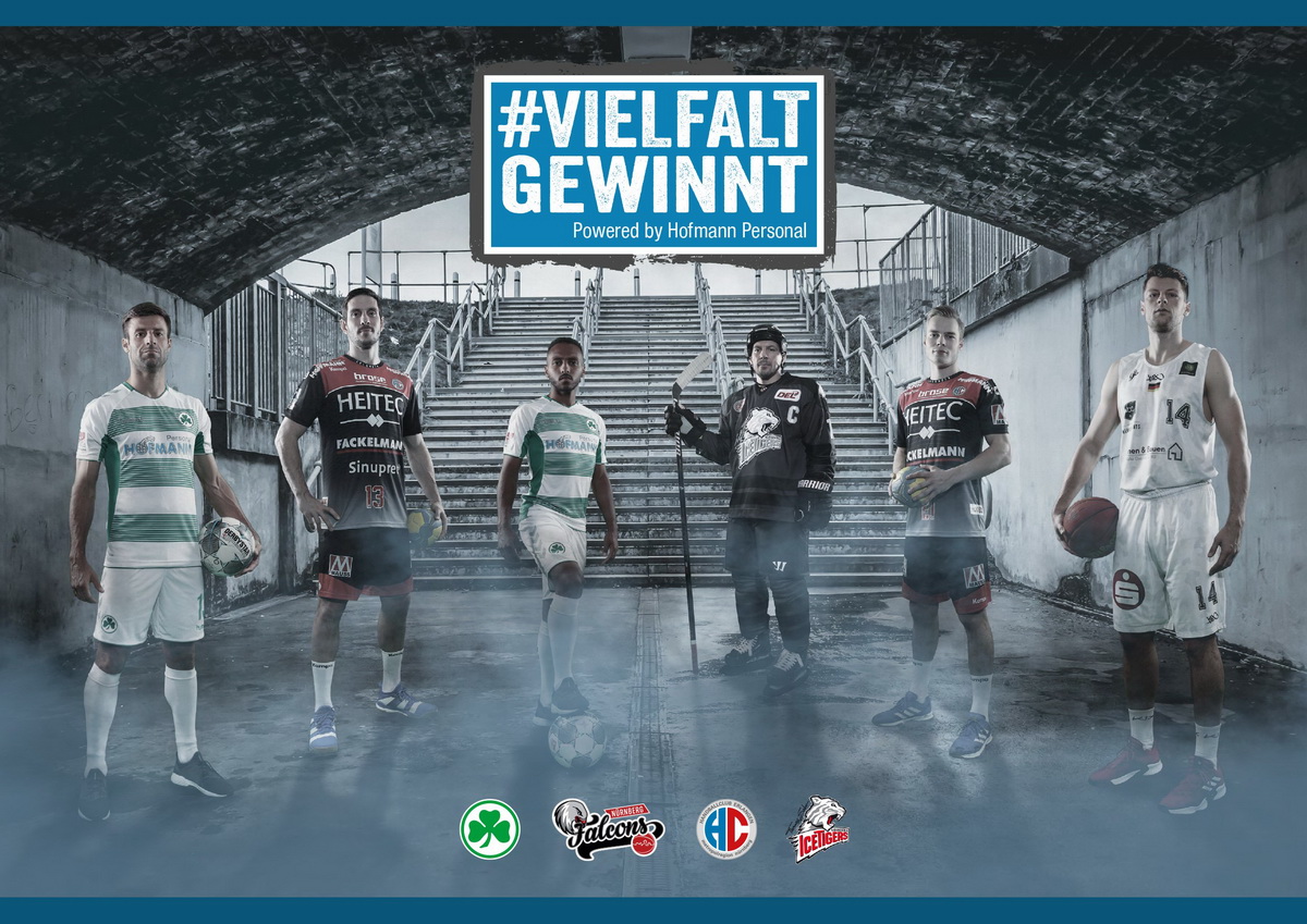 Hofmann Personal und die Partnervereine HC Erlangen, Nürnberg Falcons, SpVgg Greuther Fürth und THOMAS SABO Ice Tigers starten heute gemeinsam die Initiative „Vielfalt gewinnt“, um ein klares Zeichen für ein gutes Miteinander und gegen jede Art von Diskriminierung, Ausgrenzung und Rassismus zu setzen.
