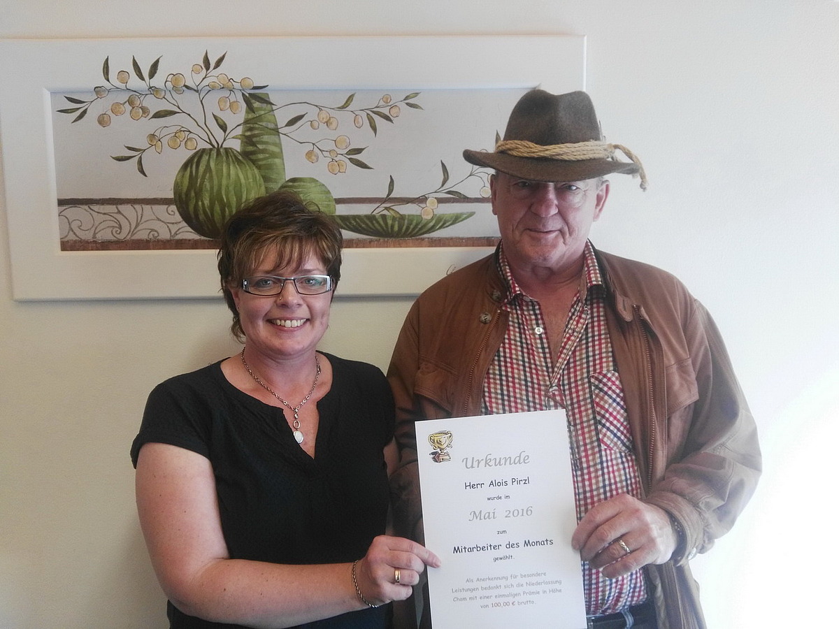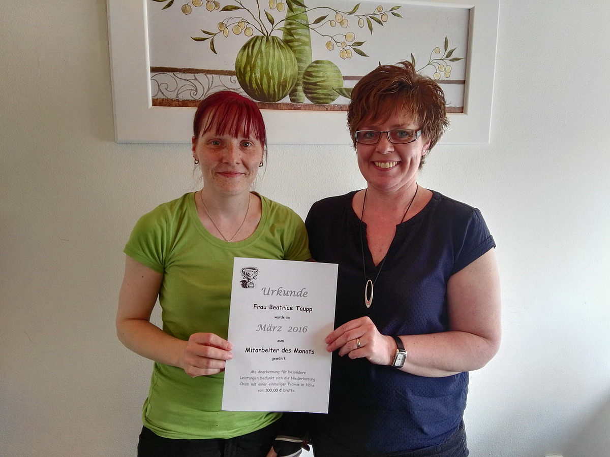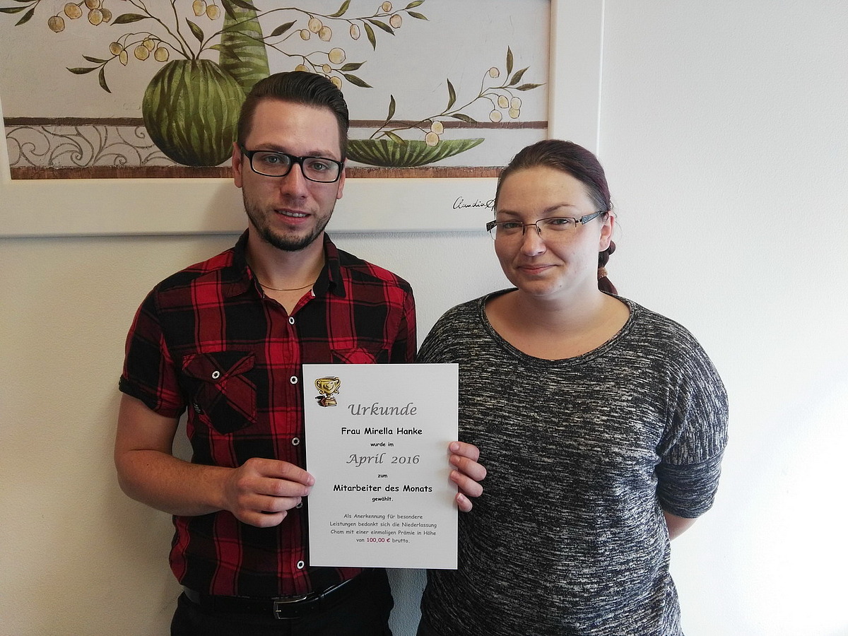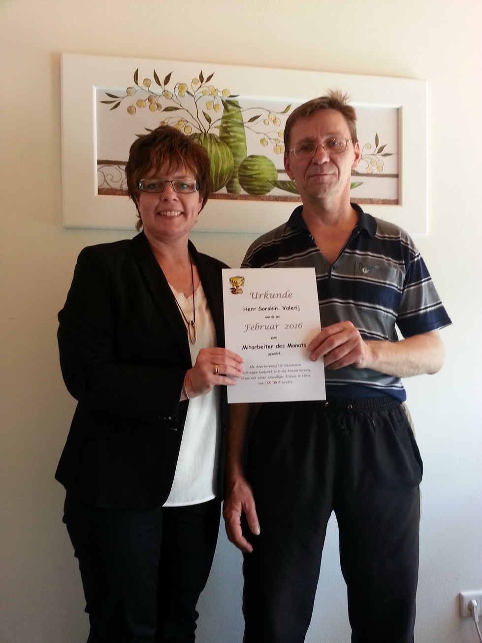 Juni 2016 – Teamassistentin Elke freut sich: „Dieses Jahr konnten wir schon wieder vier Mitarbeiter auszeichnen, die die Kriterien für den „Mitarbeiter des Monats“ erfüllten. Valerij Sorokin ist seit Juli 2015 als Staplerfahrer im Einsatz. Er und sein Kollege Alois Pirzl sind vor allem durch ihre hohe Zuverlässigkeit und Einsatzbereitschaft ausgefallen. Mirella Hanke und Beatrice Taupp wiederum sind super Produktionsmitarbeiterinnen aus – zuverlässig und sehr gewissenhaft!“