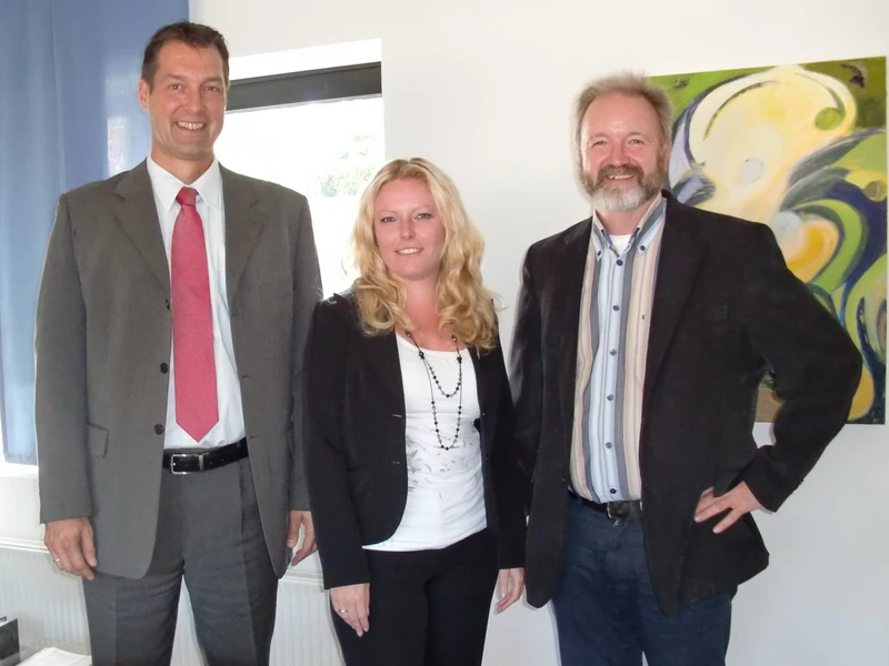 Drei Personen stehen lächelnd in einer Werkhalle vor einer Maschine; zwei tragen Arbeitskleidung, eine trägt eine gelbe Sicherheitsweste
