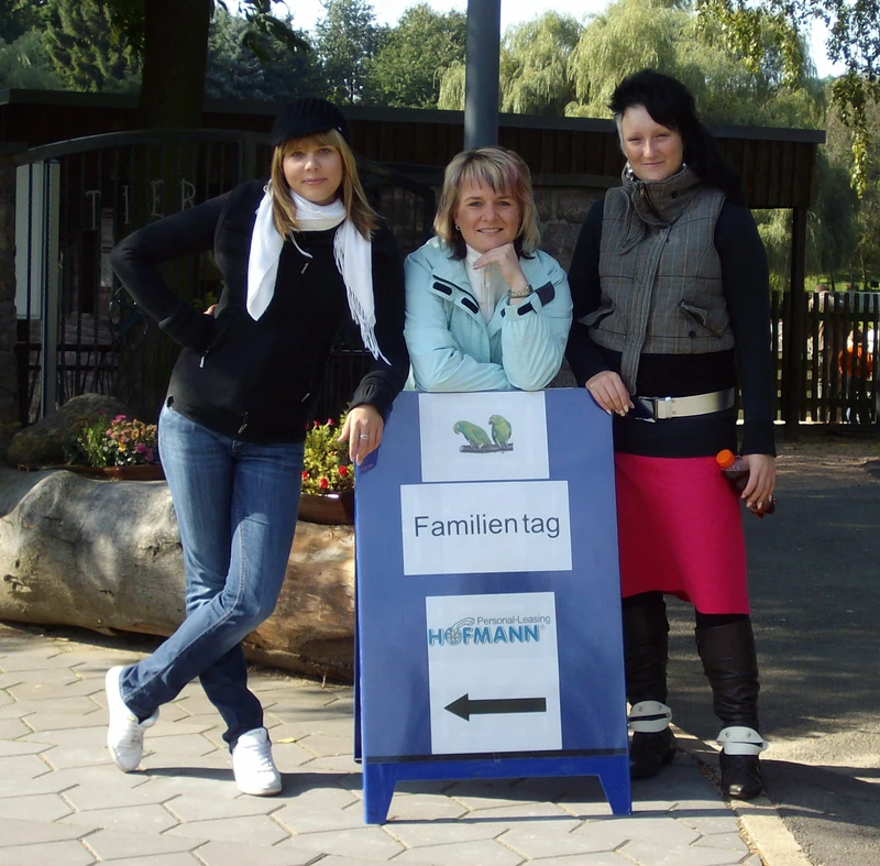 Hofmann Personal Messestand mit Beratungsgespräch an Stehtischen vor blauem Branding