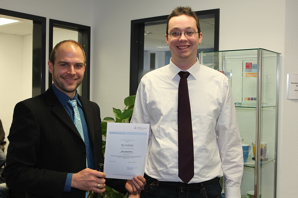 Als Pilotprojekt finden zunächst Zertifizierungen auf Basis eines Lehrbriefes zum TÜV geprüften Montagehelfer/Maschinenbediener statt. Prüfungen für weitere Fachbereiche wie Logistik oder kaufmännische Kräfte sind in Planung. „Das Zertifikat bescheinigt den Mitarbeitern nachweisbar den Erfahrungszuwachs durch die Zeitarbeit und belegt so die Qualität ihrer Arbeit sowie das Potenzial, sich weiter zu entwickeln“, so Dr. Monika Bias von der TÜV Rheinland Personenzertifizierung. Die Prüfung, zu der nur zugelassen wird, wer die notwendige Arbeitserfahrung und entsprechende Weiterbildungen vorweisen kann, besteht aus einem schriftlichen Test und einem mündlichen Teil, der durch die Fachleute des TÜV Rheinland durchgeführt wird.