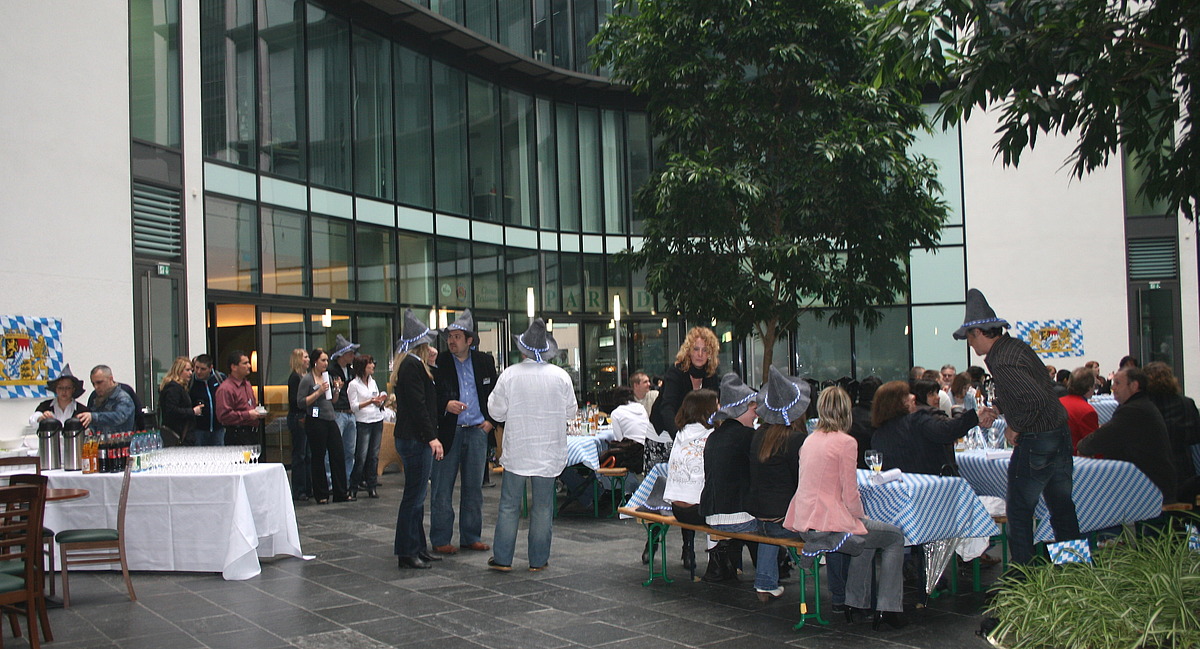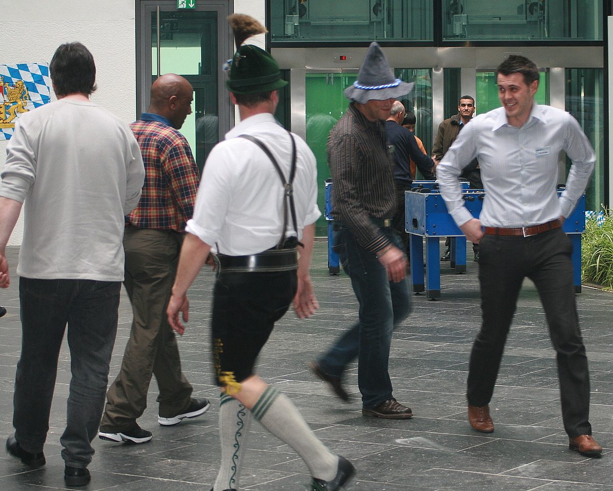 Das überdachte Foyer vor dem Frankfurter Niederlassungsbüro war ein idealer Platz, um ein ansprechendes Buffet aufzubauen und den Gästen ein kleines Programm zu bieten. Hofmann Personal Leasing hat bayerische Wurzeln. Anlass genug, einen bayerischen „Tag der offenen Tür“ zu organisieren. Natürlich mit bayerischen Spezialitäten, dem passenden Bier und bayerischen Volkstänzen, wie dem Schuhpladler.
