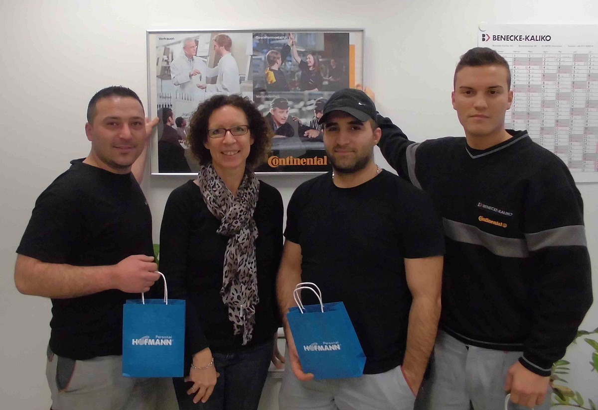 Dezember 2013 - Murat Ates, Hüsamettin Sentürk und Serhat Salgin haben es geschafft: Alle drei Mitarbeiter erhielten das Angebot, in das Kundenunternehmen zu wechseln. Freudestrahlend nahmen die ehemaligen Kollegen die Glückwünsche und ein Vitamin-Paket von Personaldisponentin Luise Hirner entgegen.