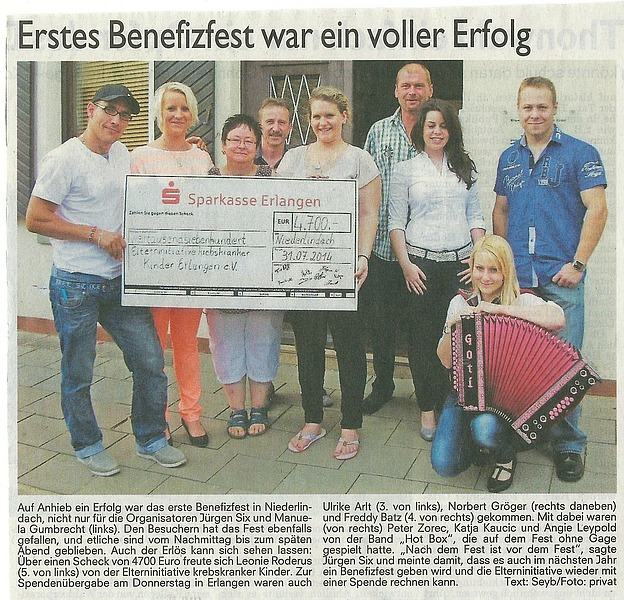 Ganz wichtig war es ihm daher, sich für andere zu engagieren und in Form einer Benefizveranstaltung für krebskranke Kinder etwas an das Leben zurückzugeben. Er betont: „Eine Hand wäscht die andere. Das ist aufgrund meiner Erfahrung fast schon mein Lebensmotto! Diese Kinder liegen mir sehr am Herzen, denn in unserer Nachbarschaft gab es letztens erst einen solchen Krankheitsfall. Und da wir hier in Erlangen die Elterninitiative für krebskranke Kinder haben, war es für mich naheliegend, mit dieser Veranstaltung Spendengelder zu sammeln.“
