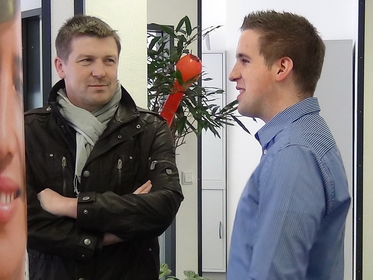 Neben netten Gesprächen mit Kunden, Mitarbeitern und Bewerbern im Büro konnte sich jeder eine frisch gebratene Coburger Bratwurst im Innenhof genehmigen. Dort trotzten alle unter großen Schirmen und mit einem Glas Sekt dem schlechten Wetter.