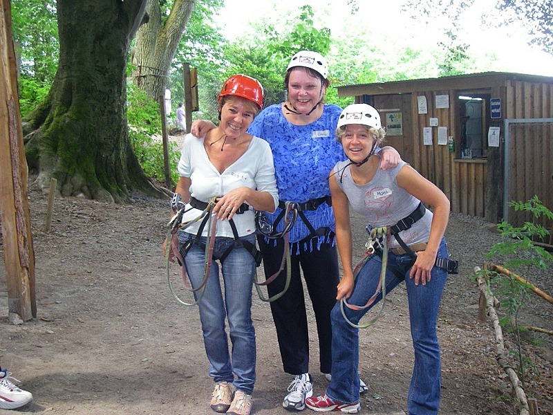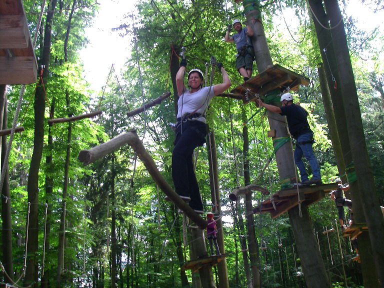 Juli 11 – Unter dem Motto „Fit für den Job“ lud die Niederlassung Marktheidenfeld ihre Mitarbeiter zum Sommerfest nach Haibach ein. Der Tag hielt viele Überraschungen bereit. Zum einen konnten sich die Teilnehmer hoch oben in den Bäumen im Kletterwald auspowern, andererseits brachte Trainerin Moni mit speziellen Übungen am Boden Körper und Geist in Einklang. Durch gegenseitige Hilfestellungen, Vertrauensübungen sowie Gruppenspiele zur Selbst- und Fremdwahrnehmung stellten alle überrascht fest, was sie doch weit mehr leisten können, als sie jemals geglaubt hätten. Da sich auch gleich nebenan ein Wildpark befand, konnten ganz nebenbei auch noch Esel, Reh und Wildschwein in natura aus nächster Nähe betrachtet werden. „Am Ende musste natürlich etwas Ordentliches zu essen her“, erzählt die Büroverantwortliche Carolin Zimmermann. „Darum kehrten wir mittags im Restaurant „Old Church“ ein.“ Begeistert fasste Mitarbeiterin Aydin Melek den Tag kurz und knapp zusammen: „Diesen Tag werde ich nie vergessen!“ Dem kann sich das Team der Niederlassung Marktheidenfeld nur anschließen.
