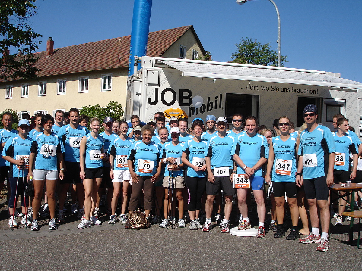 Das Hofmann-Team konnte sich über viele Anmeldungen freuen. Sechzig Mitarbeiter und Kunden liefen mit uns - natürlich im Hofmann-Shirt. Im Rahmen unseres Spendenmarathons 2008 wird die Firma pro gemeldeten Teilnehmer 100 Euro auf ein Sammelkonto einzahlen und zum Ende des Jahres für wohltätige Zwecke den Regionen zur Verfügung stellen. Insgesamt liefen übrigens 416 Erwachsene und 113 Kinder mit.