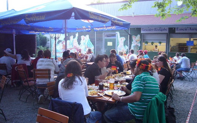 Juni 08 - Eine ganze Nation im Fußballfieber. Was gibt es Schöneres, als gemeinsam eine EM oder WM zu erleben? Das Würzburger Team nutzte die Gelegenheit und lud Mitarbeiter und Kunden mit Familien und Freunden zum gemeinsamen Public Viewing ein. „Die Stimmung ist immer wieder klasse“, meinte Niederlassungsleiterin Petra Bernhart. „Selbstverständlich haben auch wir unser schwarz-rot-goldenes Fußball-Equipment (Trillerpfeifen, Mützen und Hofmann-Fußbälle) verschenkt. Da die Nachfrage so enorm hoch war, werde ich vorsorgen und in zwei Jahren zur WM meinen Vorrat erweitern“, erzählt Petra Bernhart lachend. Schade, dass es vorbei ist!