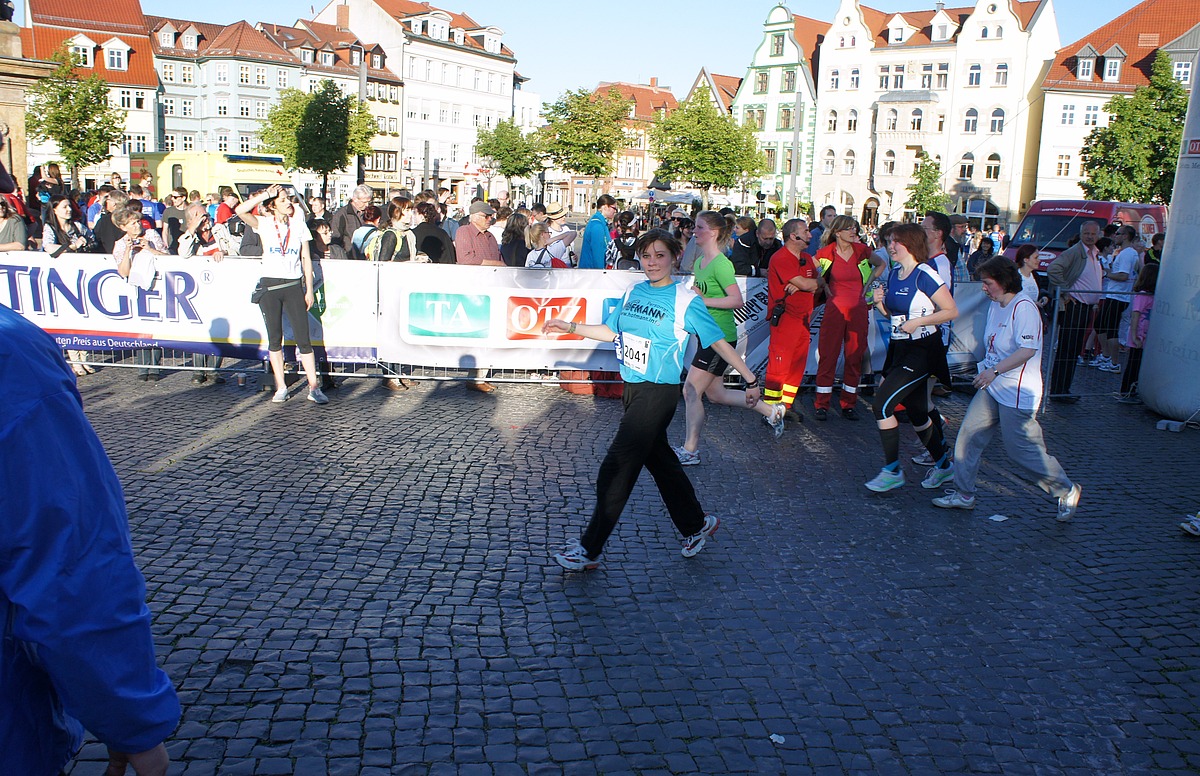 Rund um den Erfurter Domplatz herrschte bereits gut zwei Stunden vor dem offiziellen Beginn reges Treiben. Bei strahlendem Sonnenschein ging es ans gemeinsame Aufwärmen, bei dem man einen guten Blick auf die Bühne erheischen konnte. Untermalt von Musik und diversen Showeinlagen wurde hier die durch die Teilnahmegebühren erwirtschaftete Summe von € 1.700 an die Kinderkrebshilfe übergeben.