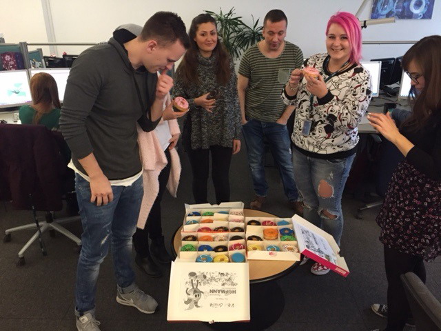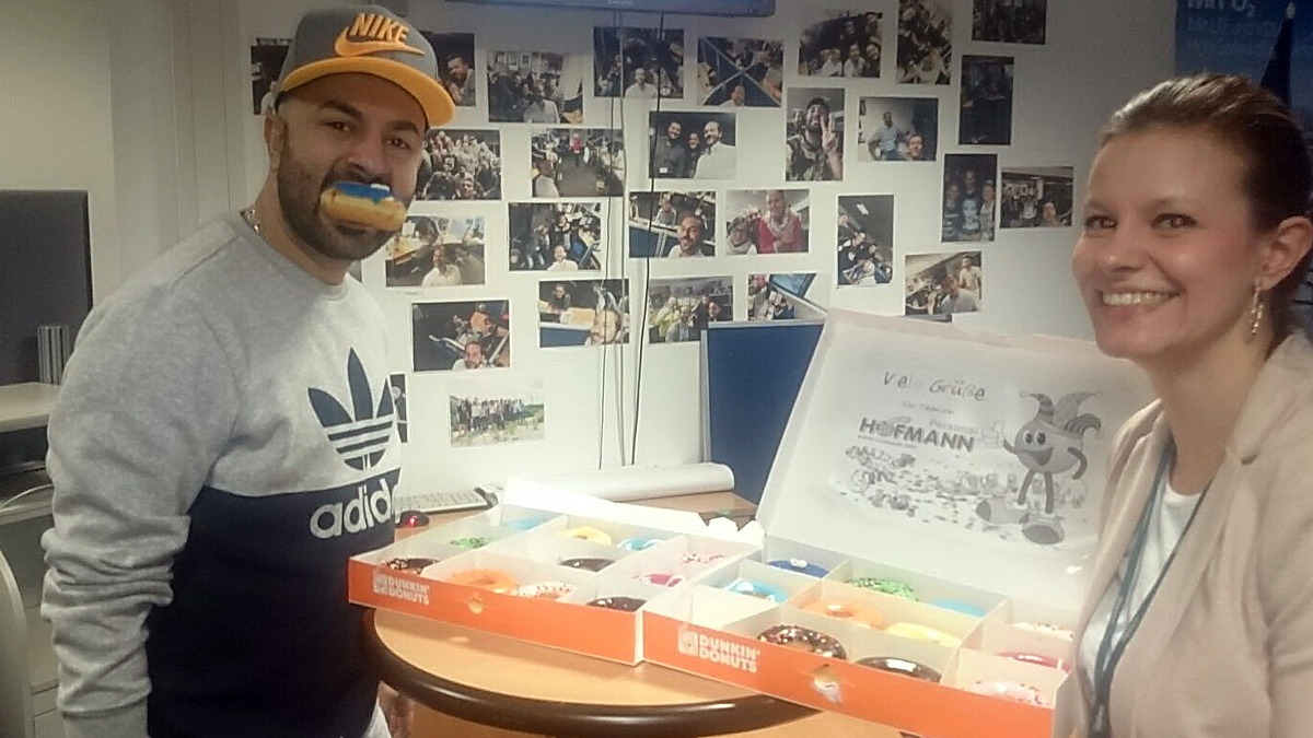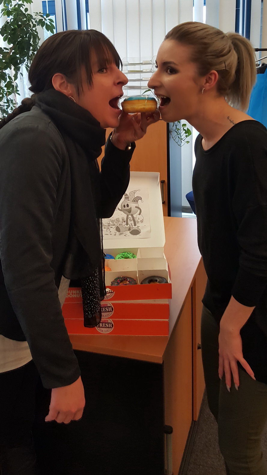Februar 2016 – „Bei dem trüben Winter muss man sich doch zur Aufmunterung mal etwas Nettes für die Kollegen einfallen lassen“, findet Sabrina Hamacher. Da bot sich die Faschingszeit geradezu an, um wunderbar schmeckende, bunte Donuts zu verschenken. Da sagte keiner „nein“!
