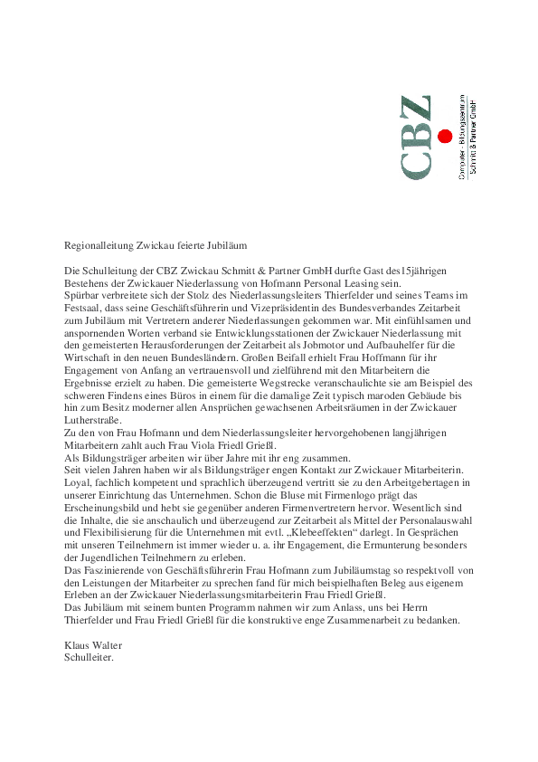 Die Vorbehalte sind längst verschwunden. Inzwischen beschäftigt die Niederlassung 285 Zeitarbeitmitarbeiter. Einige langjährige Mitarbeiter gehörten zu den über 100 Gästen, die bei der Jubiläumsfeier am 03. Juni im Brauhaus dabei waren. „Zu diesem Fest haben wir unsere Kunden eingeladen, um uns bei ihnen zu bedanken“ erzählt der Niederlassungsleiter. „Im September folgte noch ein Mitarbeiterfest. Schließlich sind sie es, die mit ihrer Zuverlässigkeit und qualifizierten Arbeit unseren guten Ruf haben entstehen lassen.“