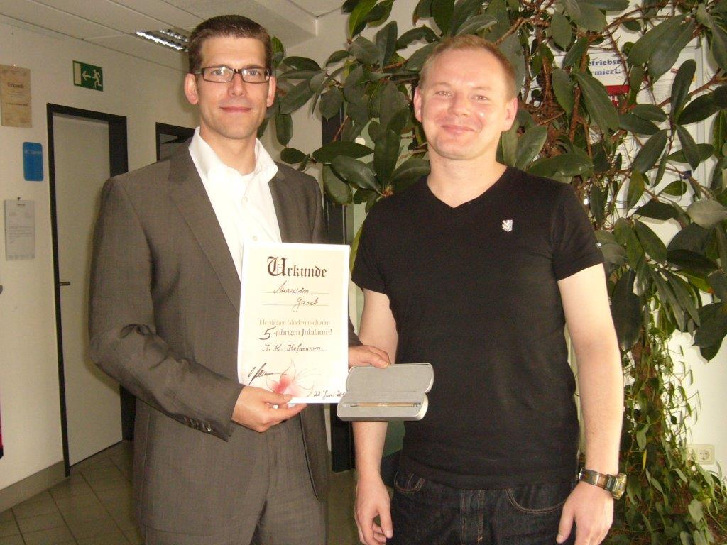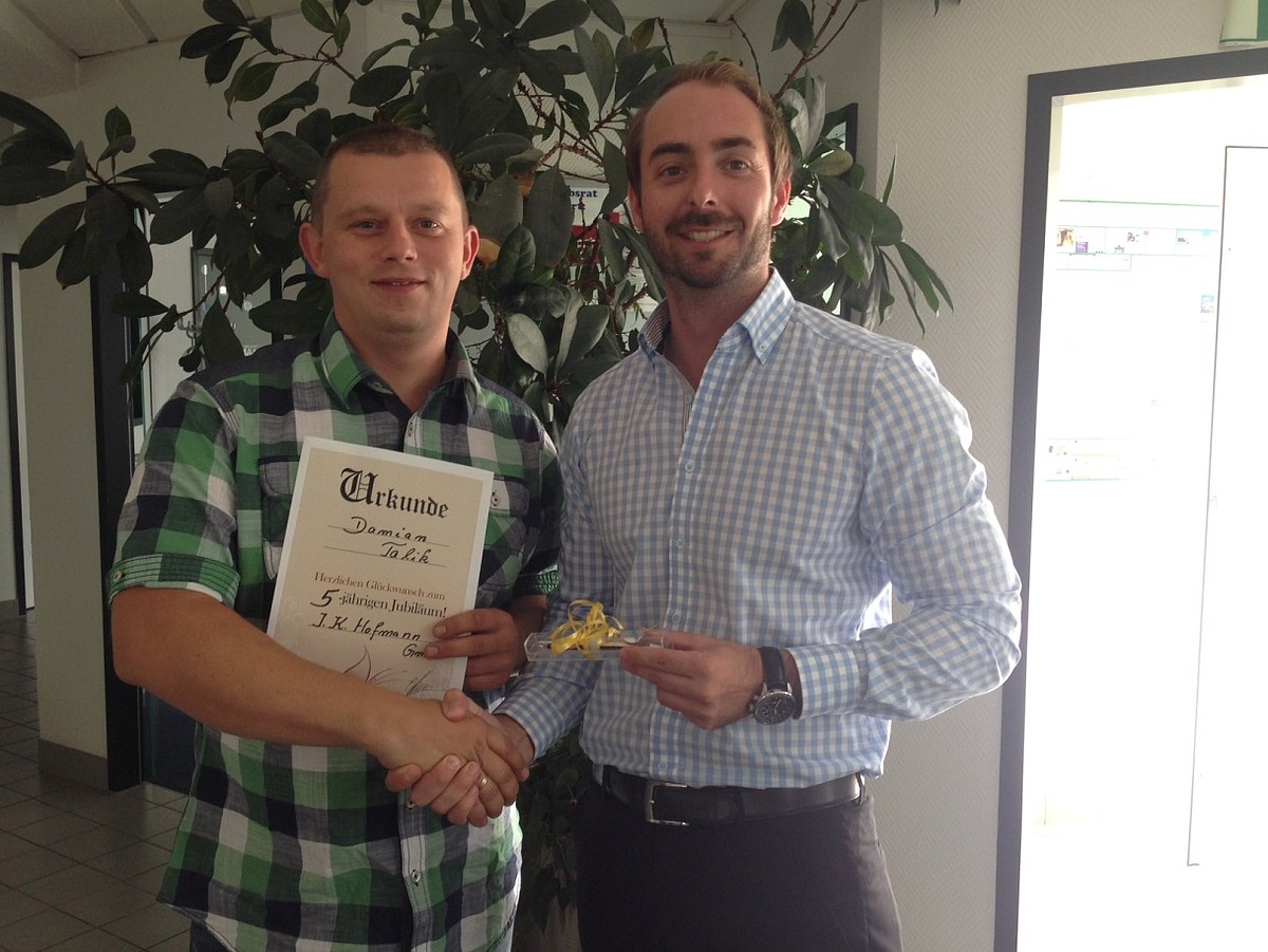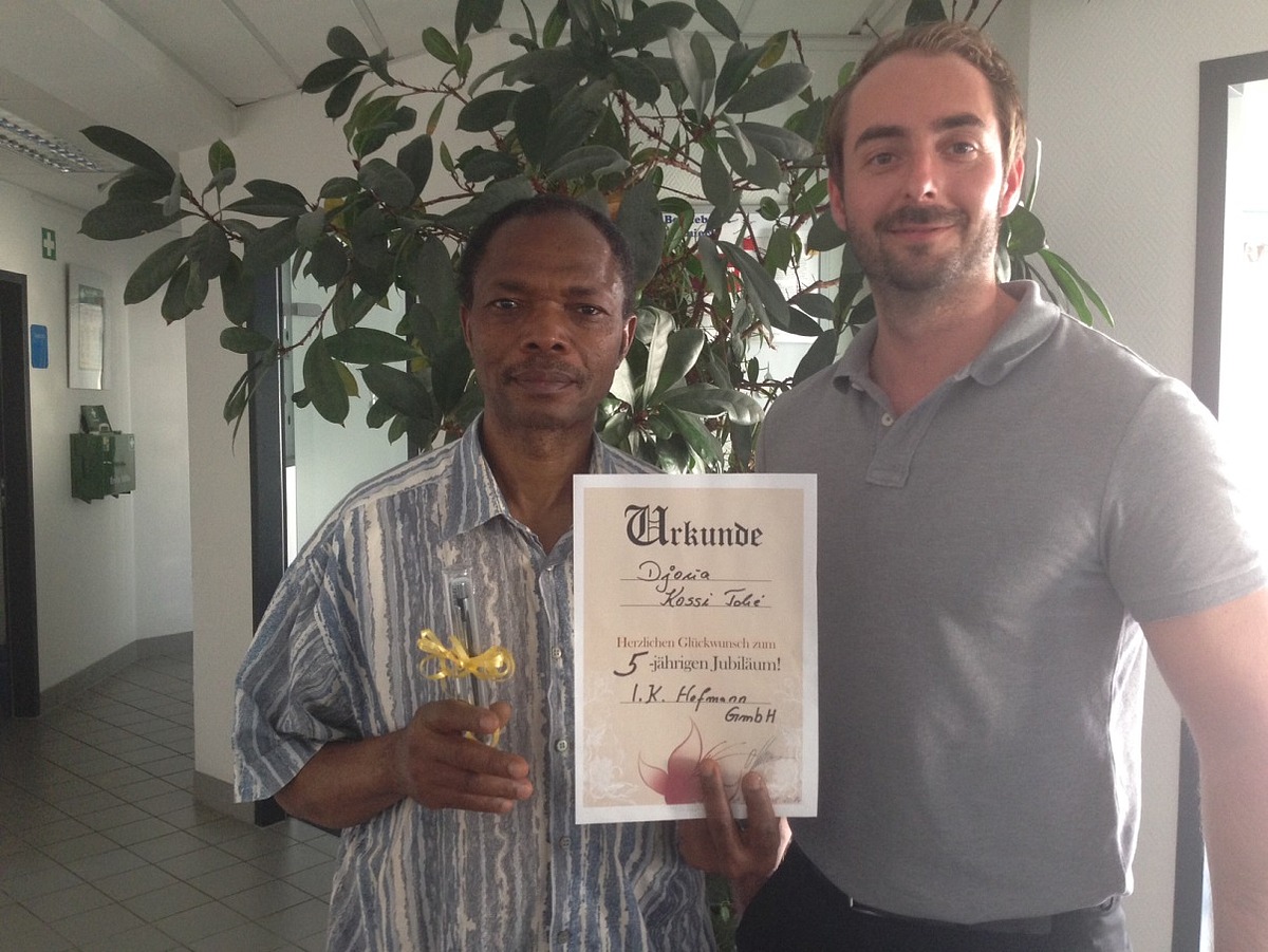 2014 - Seit fünf Jahren sind Kossi Tche Djoua, Marcin Gasch, Albert Kron, Damian Talik und Dagmar Oehmichen bei uns im Unternehmen. Alle fünf sind einfach ungeheuer sympathisch und es macht Spaß, gemeinsam mit ihnen zu arbeiten. Darum freut sich Personaldisponent Christoph Kagerer auf eine gute Zusammenarbeit für weitere fünf Jahre – gerne auch mehr.
