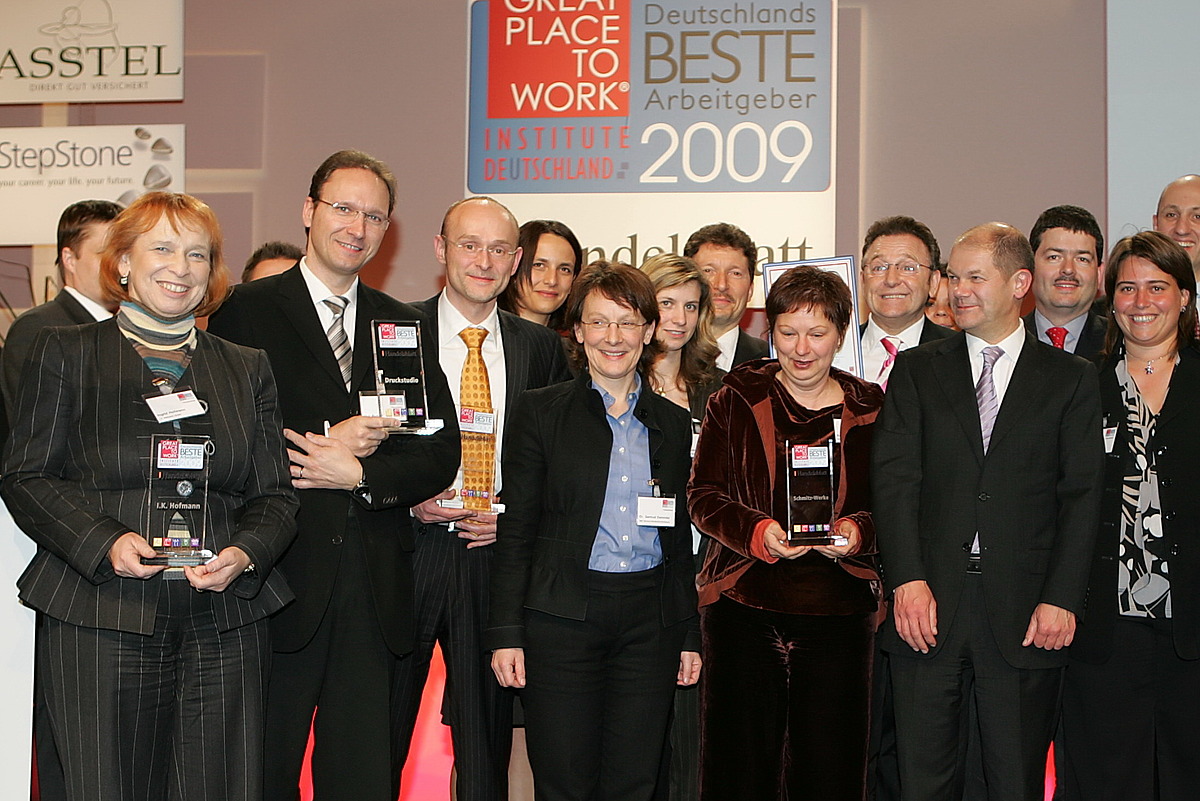 Februar 2009 –Erneut dürfen wir uns über die Auszeichnung „Beste Arbeitgeber Deutschlands“ freuen. In der Kategorie mittlere Unternehmen zählt Hofmann Personal Leasing zu den besten Arbeitgebern Deutschlands und wurde am 12. Februar in Berlin dafür ausgezeichnet.